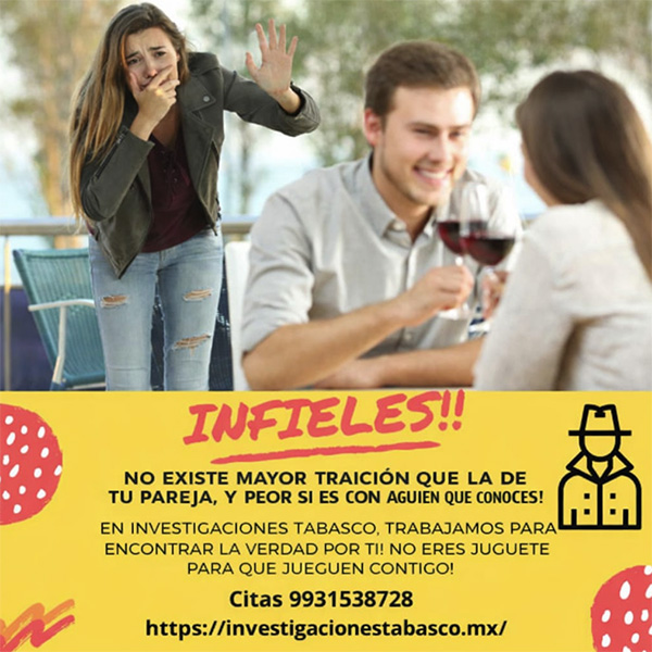 Investigaciones Tabasco (Agencia Consultora), es una Agencia de Investigación Privada, formada por un equipo de Detectives Privados en Tabasco y el Sureste Mexicano, con una amplia experiencia en el sector. Nuestra reputación se basa en la Confidencialidad, donde salvaguardar la intimidad de nuestros clientes es imperativo. La oficina está ubicada en villahermosa, aunque prestamos servicios en todo Mexico, ofreciéndole las herramientas necesarias para tomar decisiones importantes.